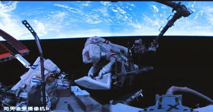 這是2025年6月26日在北京航天飛行控制中心屏幕上拍攝的神舟二十號航天員陳冬(左)與陳中瑞在空間站組合體艙外工作的畫面。新華社發(周柯毅 攝)