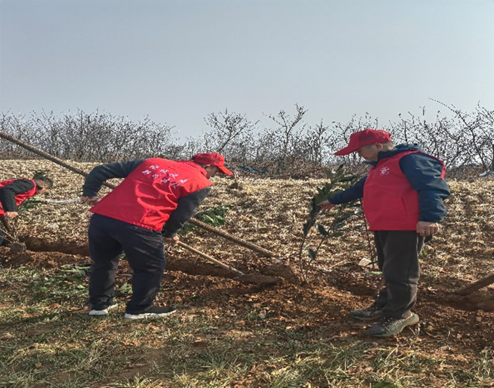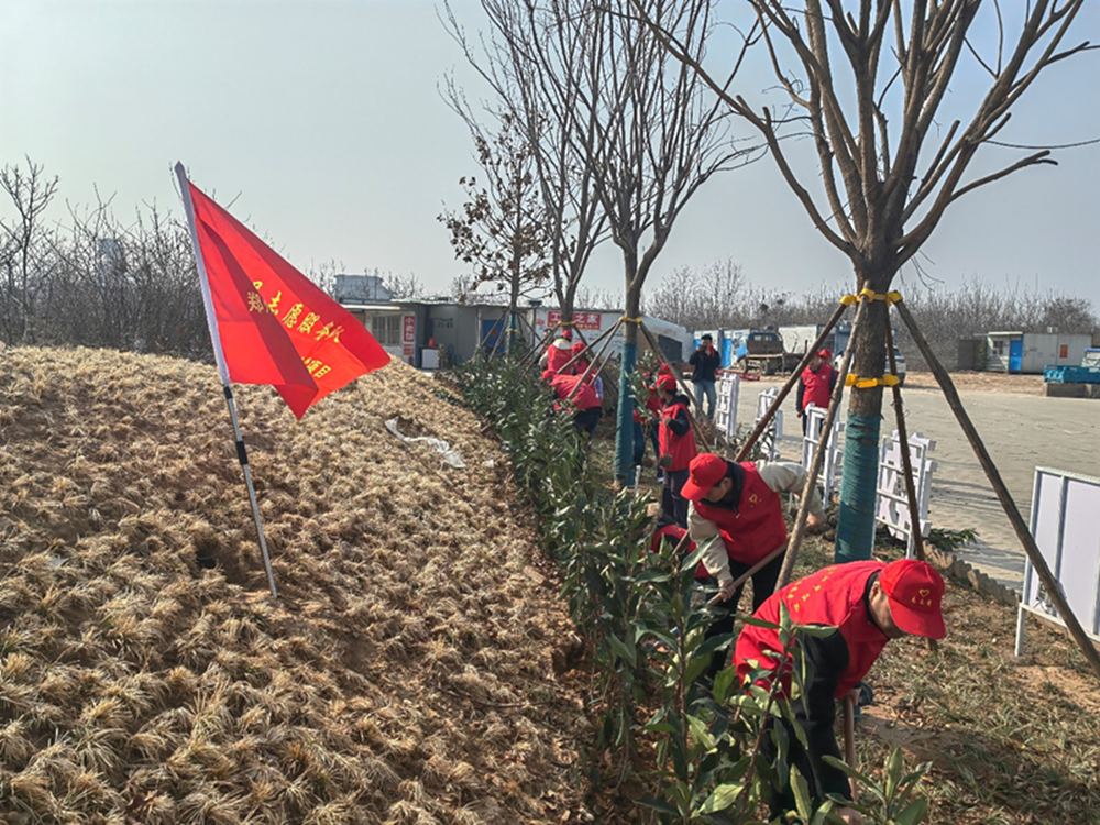 3月12日,陽光明媚,春意盎然,黨員志愿服務隊士氣高昂,手拿鐵鍬、水桶、掃把等工具,熱情高漲地投入到植樹活動中。